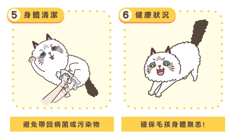 - 身體清潔:外出回家後,使用濕巾清潔貓的毛髮和腳掌,避免帶回病菌或污染物。