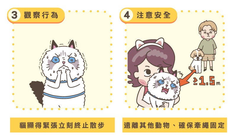 - 注意安全:遠離其他動物,避免可能引起貓恐慌的對象或聲音,切記確保牽繩固定,防止貓掙脫。