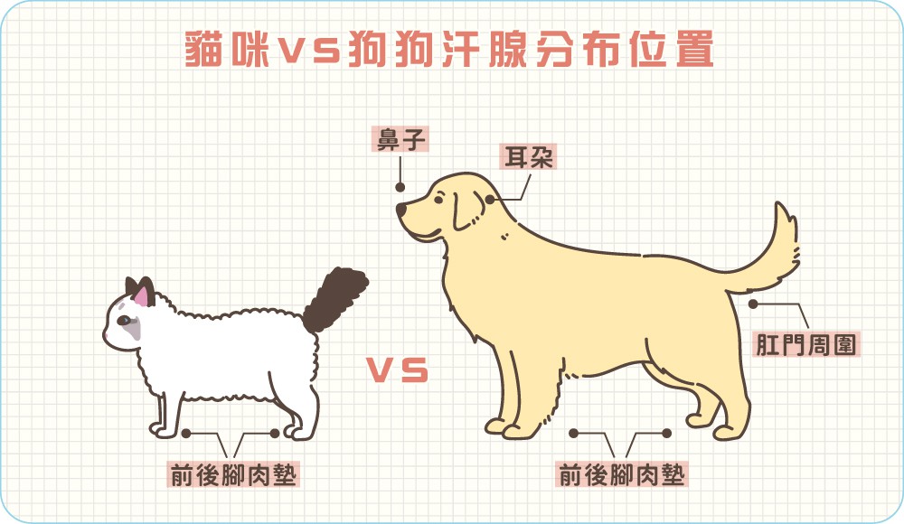 汗臭味是由皮膚表面的細菌分解蛋白質而產生,貓咪蛋白質含量及汗腺分布區域相較狗狗少,因此被細菌分解後體味較淡。