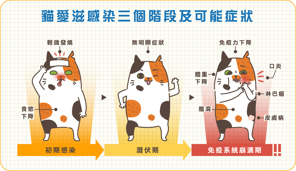 免疫系統崩潰期:反覆感染(如呼吸道、皮膚、口腔感染)、慢性牙齦炎或口炎、體重下降或消瘦、腹瀉。