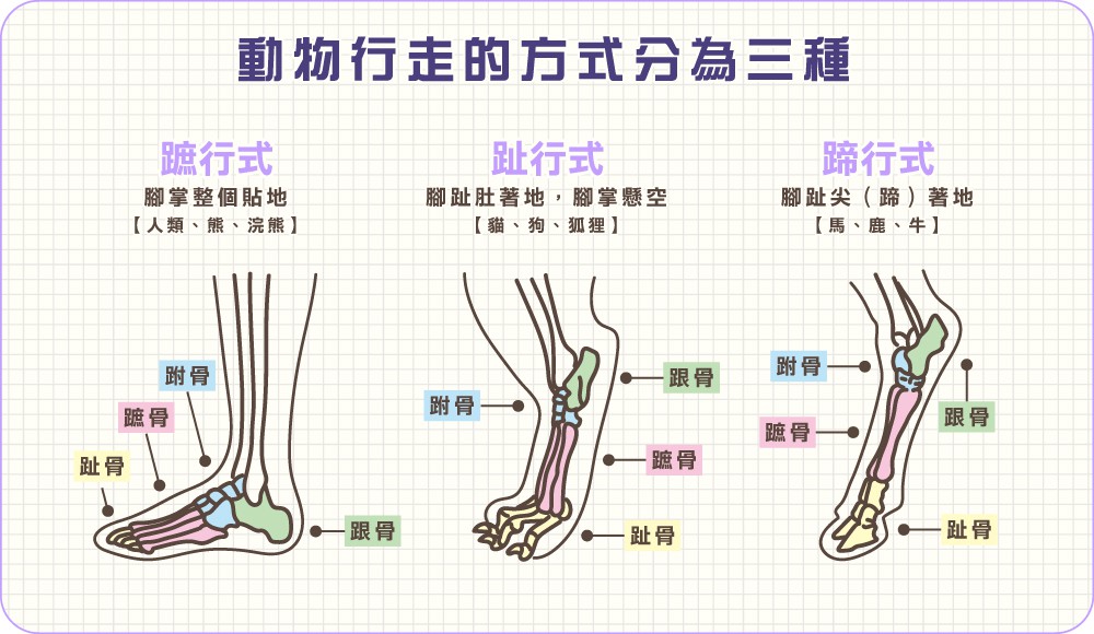 - 蹠行性(Plantigrade):腳掌整個貼地(如人類、熊、浣熊)。