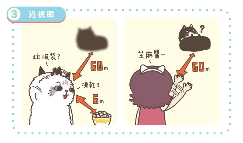 貓咪是天生近視眼,只能看清離自己約6公尺距離事物,是人類的⅒倍。