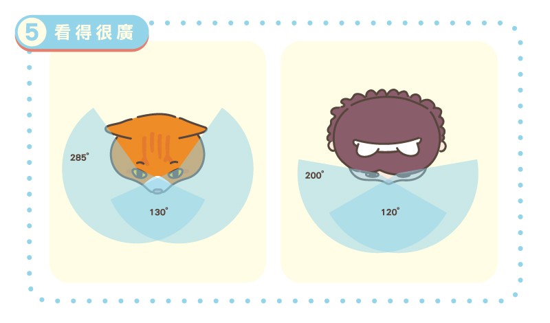 貓咪的視野大約是285度,比人類的200度更廣,使他們能夠閃躲位於斜後方的敵人。