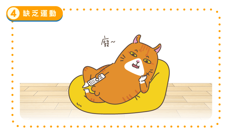 貓咪可能因甲狀腺問題、內分泌失調、關節疾病、其他健康問題甚至是結紮,而導致活動意願降低,提高肥胖的機率。