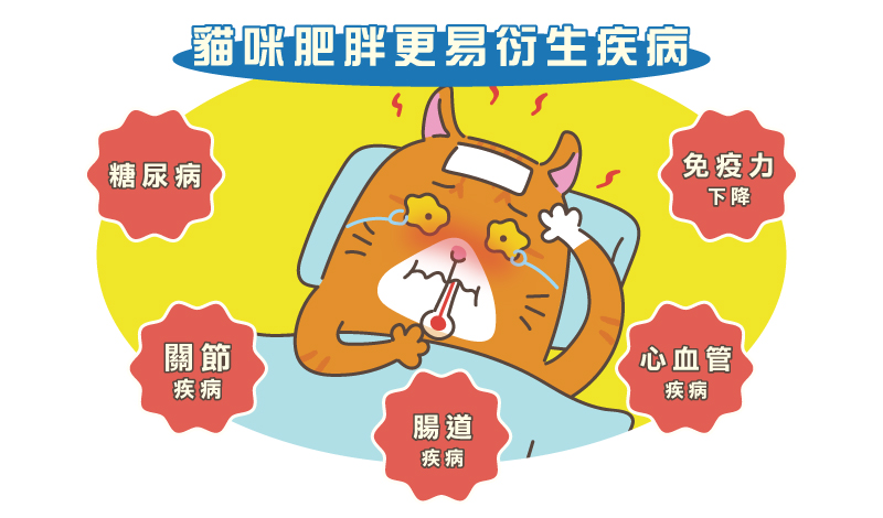貓咪肥胖容易引發疾病,如:關節疾病、心血管疾病、糖尿病、消化問題、皮膚病及呼吸道疾病等。