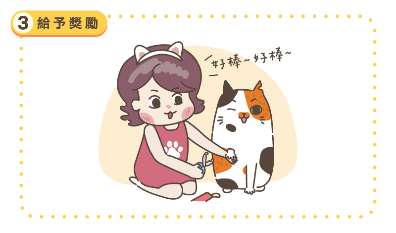 在剪指甲時給他們正向稱讚,並在剪完指甲後給他們最喜歡的零食或玩具,讓貓貓分心,忘記剛剛的不愉快~