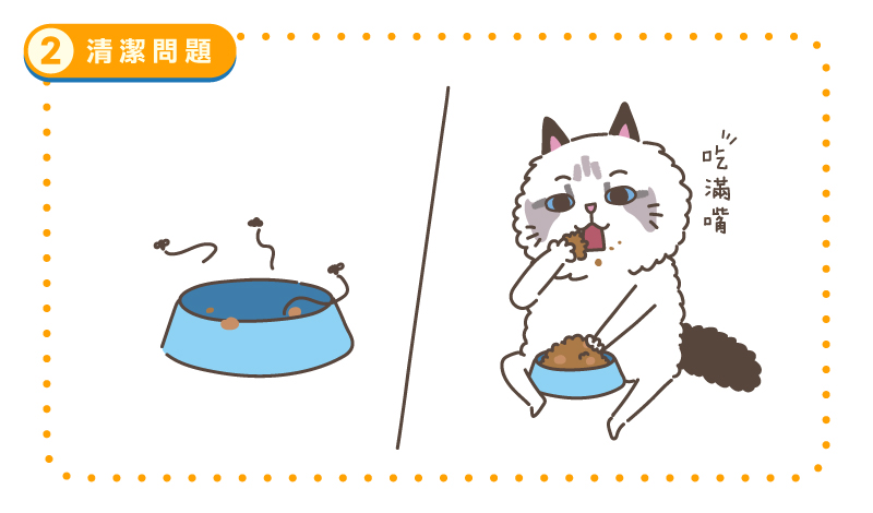 吃飯的碗沒清潔乾淨或貓咪吃飯時食物碰到下巴未馬上擦拭。