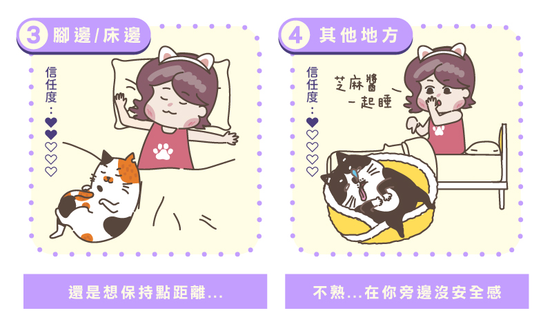 貓咪:「呃…在你旁邊沒甚麼安全感,自己睡比較自在。」